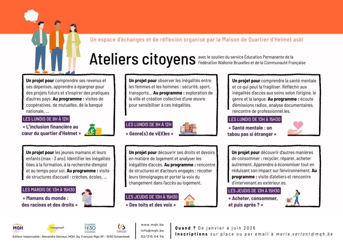 Le secteur Éducation permanente de la Maison de Quartier d’Helmet vous invite à découvrir et à participer à une série d’ateliers citoyens : un espace d’échange, de réflexion et d’action pour tout un chacun.
