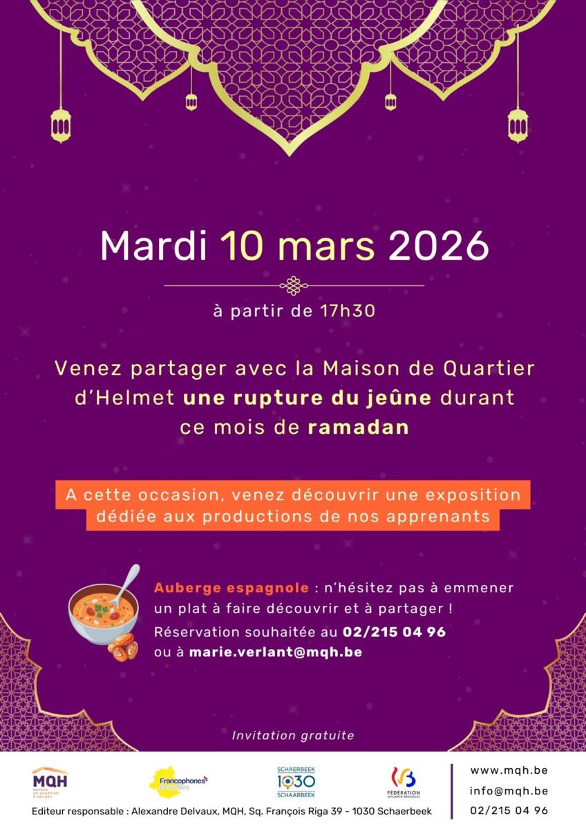 La Maison de Quartier d’Helmet vous invite chaleureusement à partager un repas de rupture du jeûne, l’IFTAR, moment convivial autour d’un buffet partagé, façon « auberge espagnole ». Quelle que soit votre origine, votre croyance, votre langue ou votre âge, en famille, seul.e, avec des ami.es, soyez tous.tes les bienvenu.es !